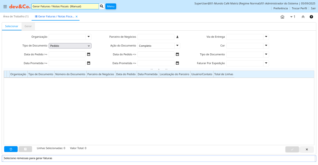Formulário: Gerar Faturas / Notas Fiscais (Manual)