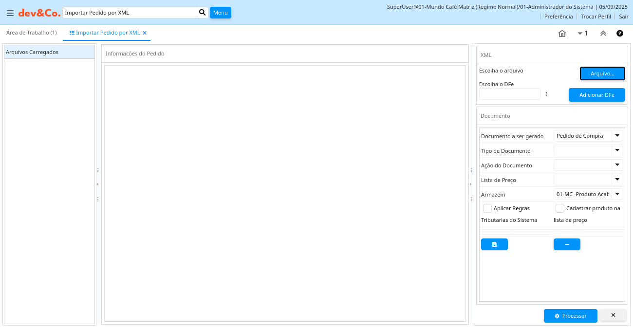 Descrição: Form personalizado que cria pedidos de compra com base em XML importado