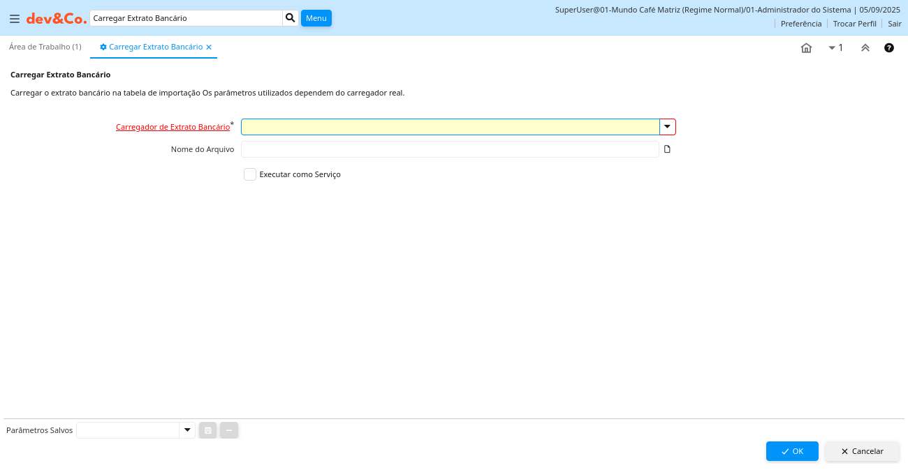 Ajuda: Carregar o extrato bancário na tabela de importação Os parâmetros utilizados dependem do carregador real.