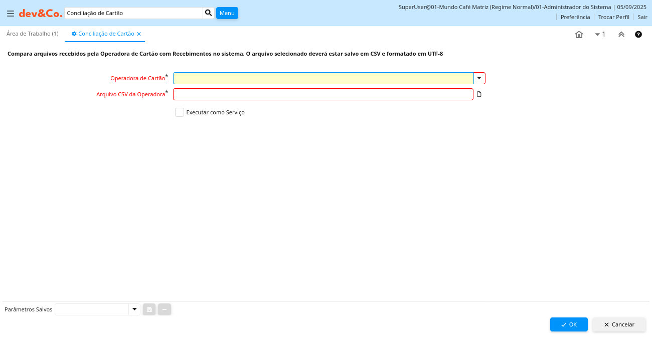 Descrição: Compara arquivos recebidos pela Operadora de Cartão com Recebimentos no sistema. O arquivo selecionado deverá estar salvo em CSV e formatado em UTF-8
