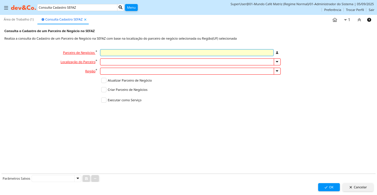 Ajuda: Realiza a consulta do Cadastro de um Parceiro de Negócio na SEFAZ com base na localização do parceiro de negócio selecionada ou Região(UF) selecionada