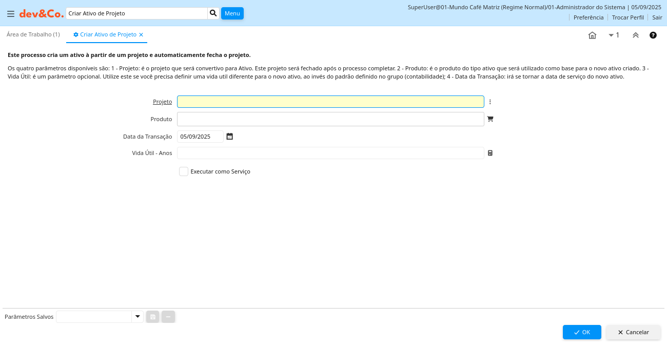 1 - Projeto: é o projeto que será convertivo para Ativo. Este projeto será fechado após o processo completar.