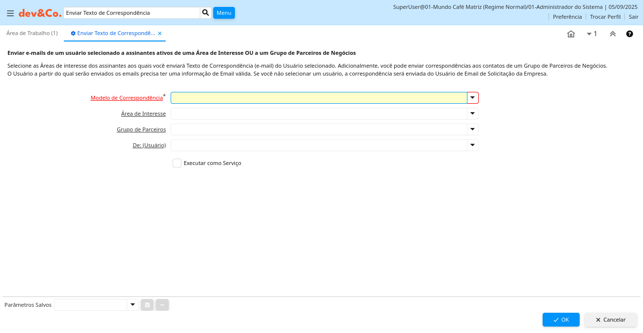 Ajuda: Selecione as Áreas de interesse dos assinantes aos quais você enviará Texto de Correspondência (e-mail) do Usuário selecionado. Adicionalmente, você pode enviar correspondências aos contatos de um Grupo de Parceiros de Negócios. O Usuário a partir do qual serão enviados os emails precisa ter uma informação de Email válida. Se você não selecionar um usuário, a correspondência será enviada do Usuário de Email de Solicitação da Empresa.