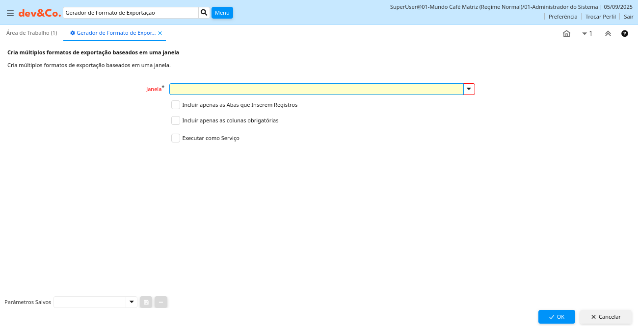 | Incluir apenas as Abas que Inserem Registros | Gera o formato de exportação apenas para as abas onde o parâmetro "Inserir Registro" está definido como Sim | IsInsertRecord Yes-No | |