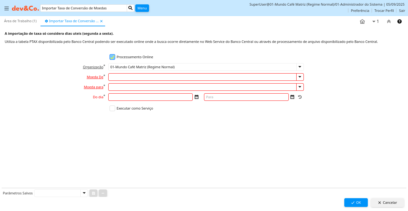 Ajuda: Utiliza a tabela PTAX disponibilizada pelo Banco Central podendo ser executado online onde a busca ocorre diretamente no Web Service do Banco Central ou através de processamento de arquivo disponibilizado pelo Banco Central.