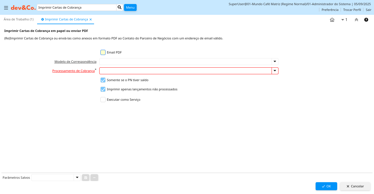 Ajuda: (Re)Imprimir Cartas de Cobrança ou enviá-las como anexos em formato PDF ao Contato do Parceiro de Negócios com um endereço de email válido.