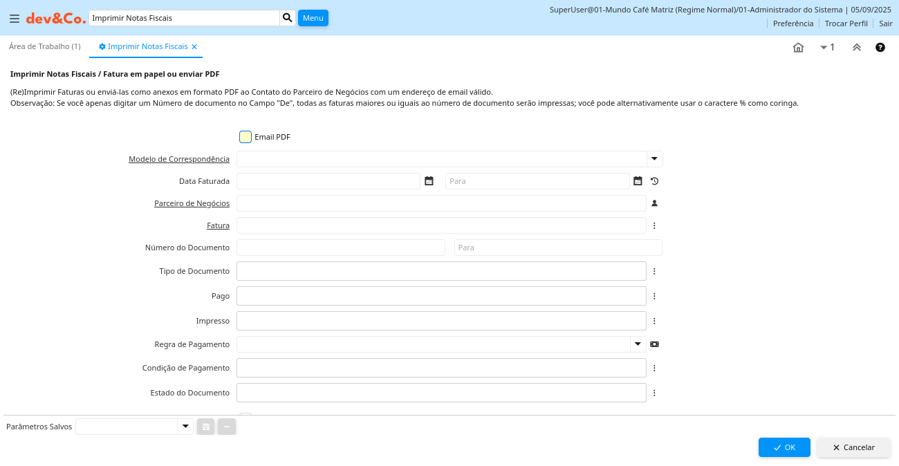 Ajuda: (Re)Imprimir Faturas ou enviá-las como anexos em formato PDF ao Contato do Parceiro de Negócios com um endereço de email válido. Observação: Se você apenas digitar um Número de documento no Campo "De", todas as faturas maiores ou iguais ao número de documento serão impressas; você pode alternativamente usar o caractere % como coringa.