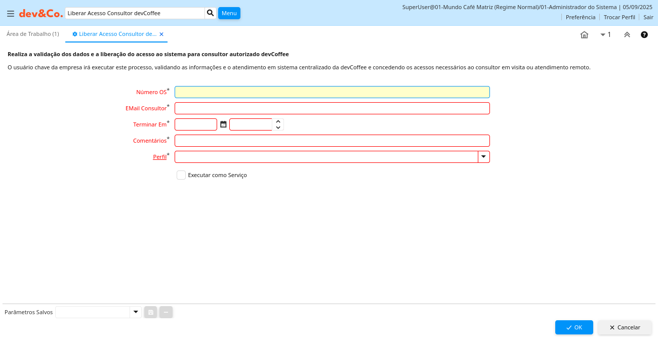 Ajuda: O usuário chave da empresa irá executar este processo, validando as informações e o atendimento em sistema centralizado da devCoffee e concedendo os acessos necessários ao consultor em visita ou atendimento remoto.