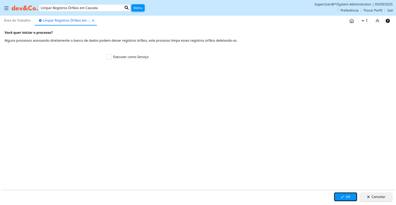 Ajuda: Alguns processos acessando diretamente o banco de dados podem deixar registros órfãos, este processo limpa esses registros órfãos deletando-os