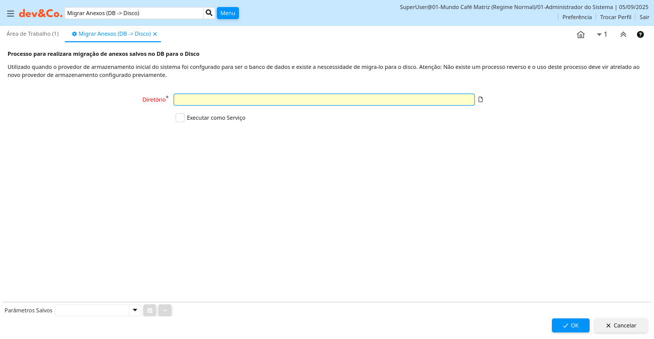 Ajuda: Utilizado quando o provedor de armazenamento inicial do sistema foi confgurado para ser o banco de dados e existe a nescessidade de migra-lo para o disco. Atenção: Não existe um processo reverso e o uso deste processo deve vir atrelado ao novo provedor de armazenamento configurado previamente.