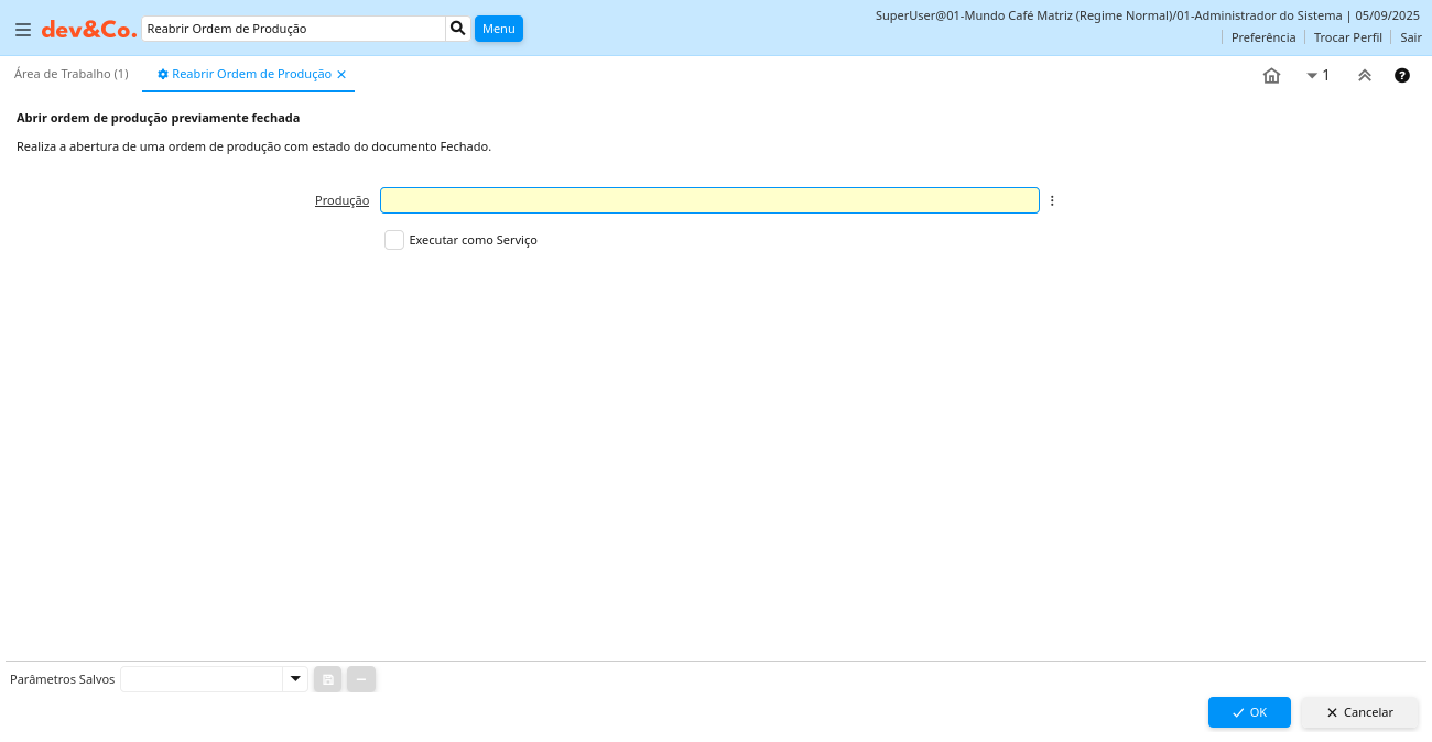 Ajuda: Realiza a abertura de uma ordem de produção com estado do documento Fechado.
