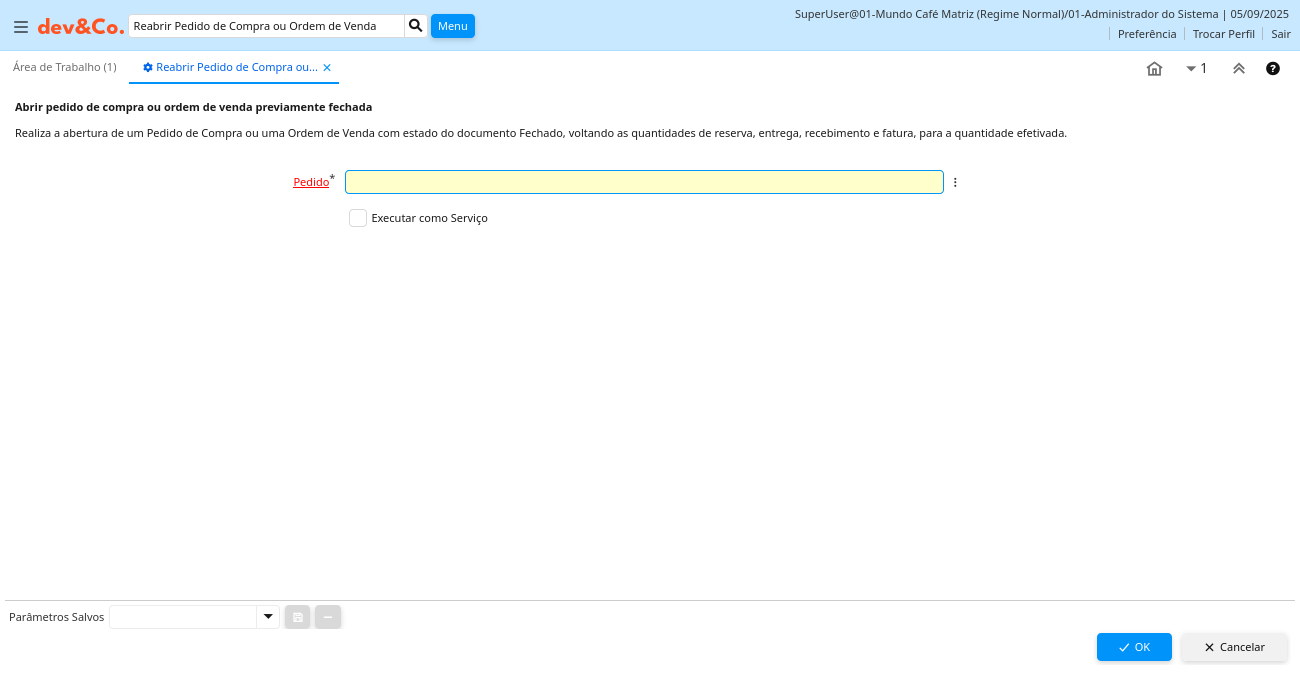Ajuda: Realiza a abertura de um Pedido de Compra ou uma Ordem de Venda com estado do documento Fechado, voltando as quantidades de reserva, entrega, recebimento e fatura, para a quantidade efetivada.