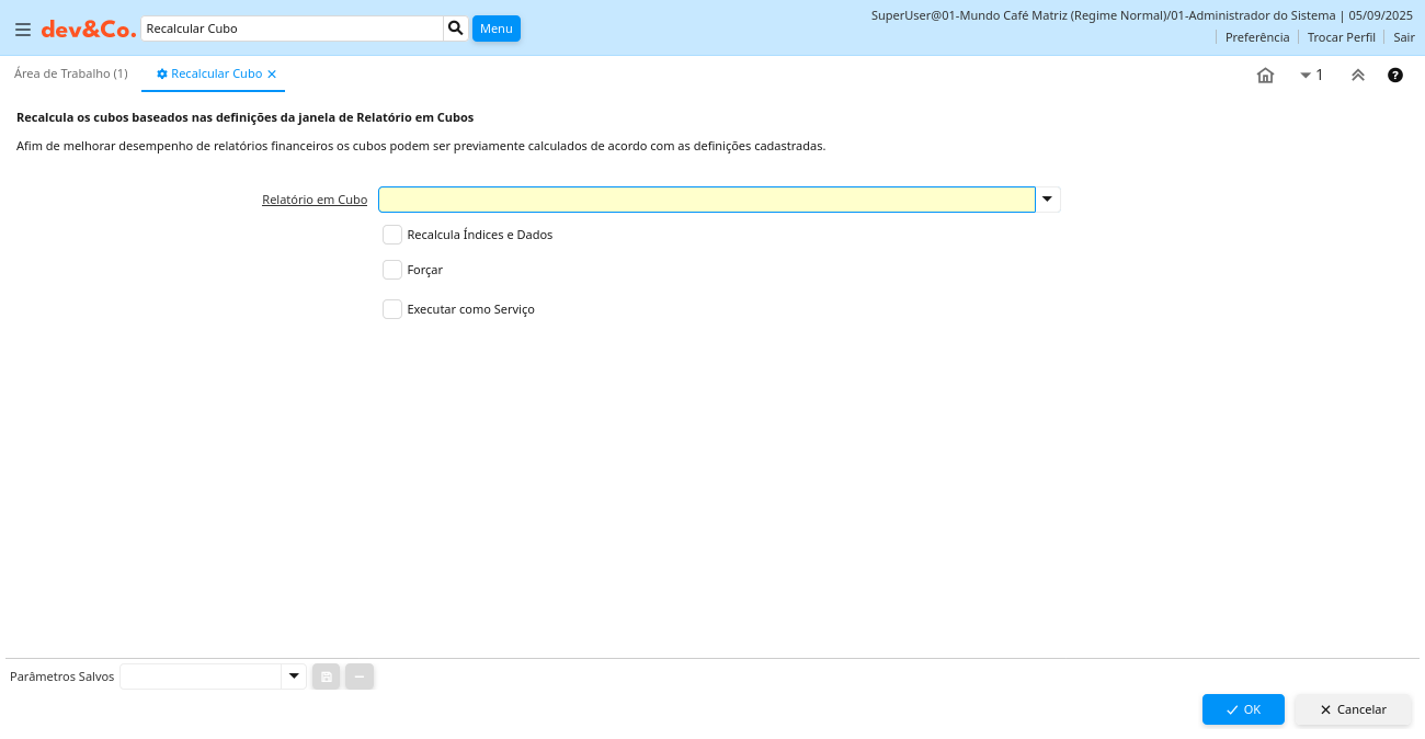 Ajuda: Afim de melhorar desempenho de relatórios financeiros os cubos podem ser previamente calculados de acordo com as definições cadastradas.