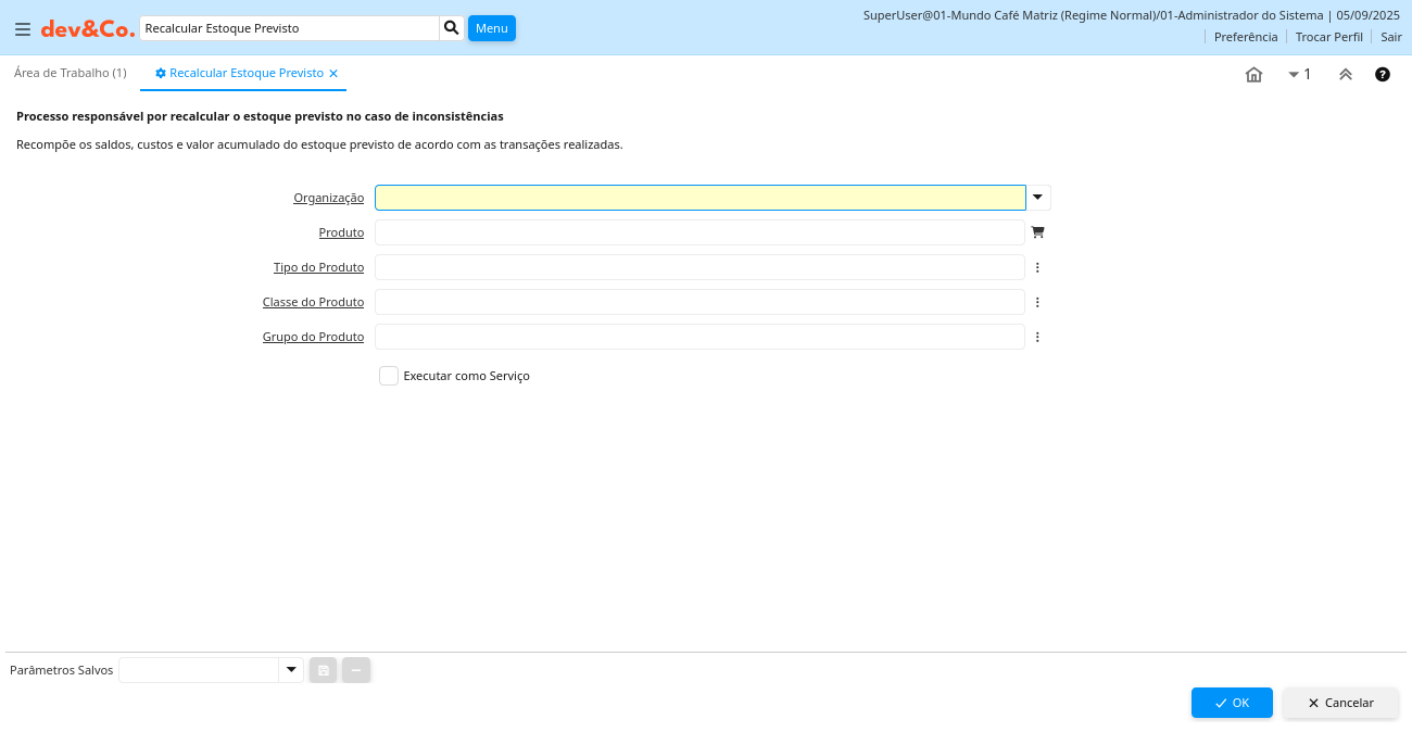 Ajuda: Recompõe os saldos, custos e valor acumulado do estoque previsto de acordo com as transações realizadas.