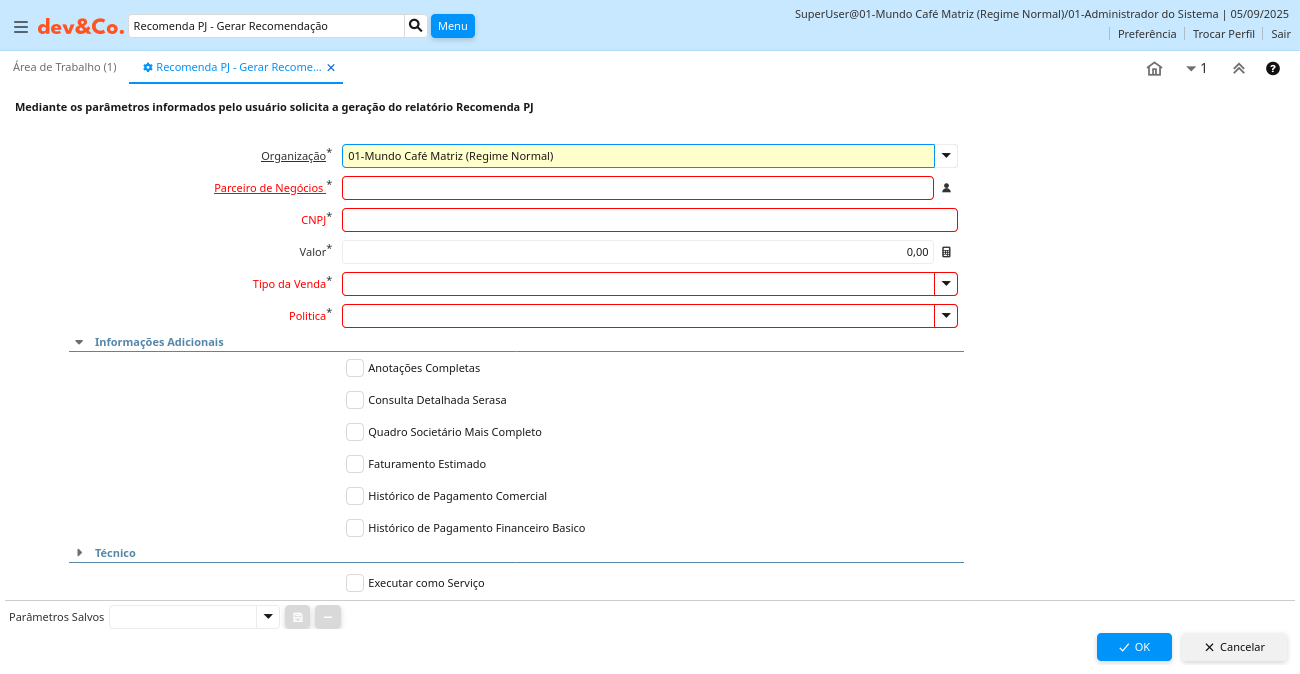 Descrição: Mediante os parâmetros informados pelo usuário solicita a geração do relatório Recomenda PJ