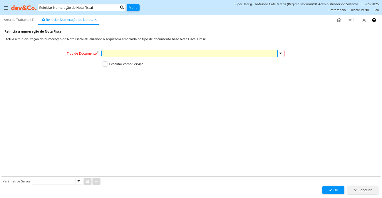 Ajuda: Efetua a reinicialização da numeração de Nota Fiscal atualizando a sequência amarrada ao tipo de documento base Nota Fiscal Brasil.