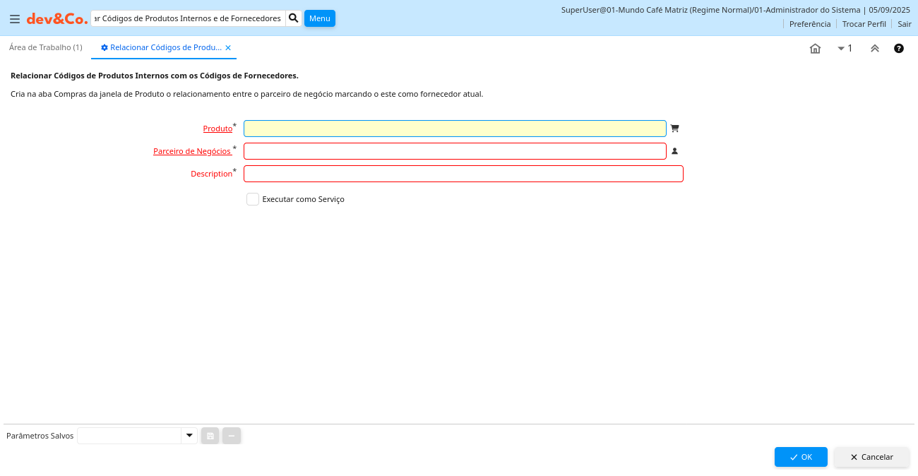 | Produto | Produto, Serviço, Item | Identifica um item que é ou comprado ou vendido por esta organização. | M_Product_ID Search |