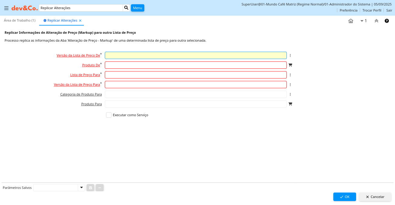 Descrição: Replicar Informações de Alteração de Preço (Markup) para outra Lista de Preço