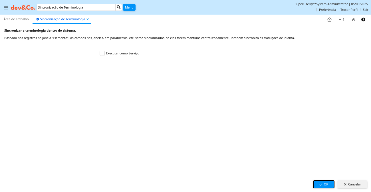Ajuda: Baseado nos registros na Janela "Elemento", os campos nas janelas, em parâmetros, etc. serão sincronizados, se eles forem mantidos centralizadamente. Também sincroniza as traduções de idioma.