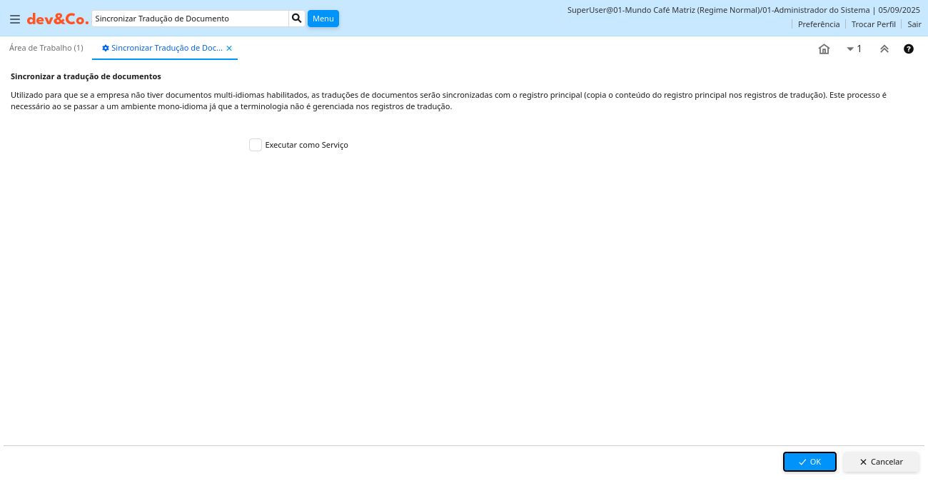 Ajuda: Utilizado para que se a empresa não tiver documentos multi-idiomas habilitados, as traduções de documentos serão sincronizadas com o registro principal (copia o conteúdo do registro principal nos registros de tradução). Este processo é necessário ao se passar a um ambiente mono-idioma já que a terminologia não é gerenciada nos registros de tradução.