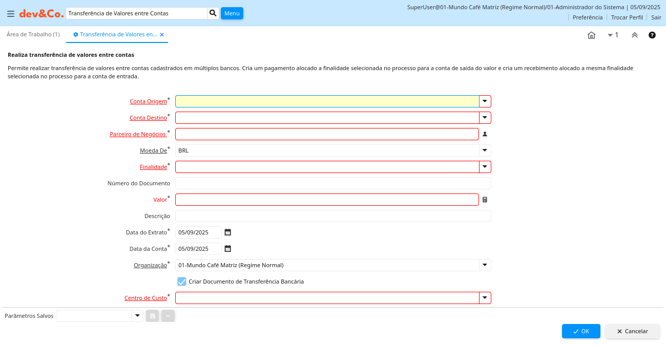 Ajuda: Permite realizar transferência de valores entre contas cadastrados em múltiplos bancos. Cria um pagamento alocado a finalidade selecionada no processo para a conta de saída do valor e cria um recebimento alocado a mesma finalidade selecionada no processo para a conta de entrada.
