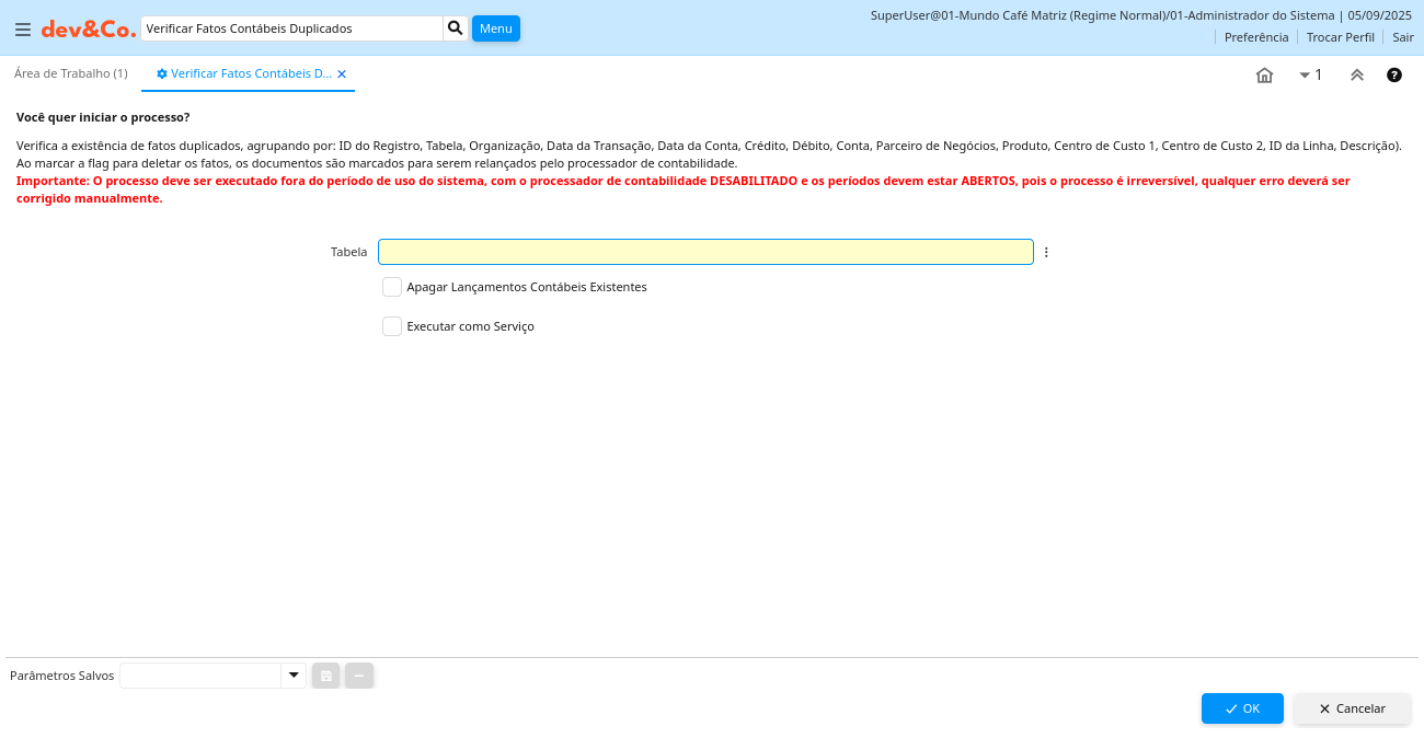 Ajuda: Verifica a existência de fatos duplicados, agrupando por: ID do Registro, Tabela, Organização, Data da Transação, Data da Conta, Crédito, Débito, Conta, Parceiro de Negócios, Produto, Centro de Custo 1, Centro de Custo 2, ID da Linha, Descrição). Ao marcar a flag para deletar os fatos, os documentos são marcados para serem relançados pelo processador de contabilidade.
