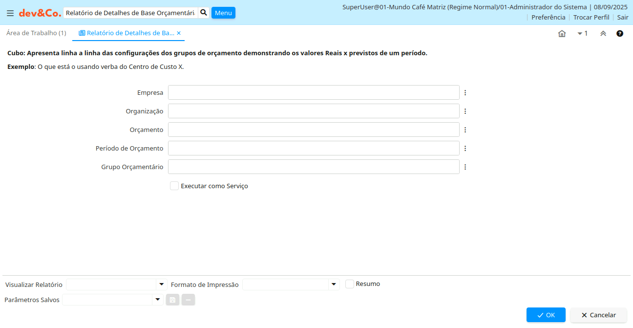 Descrição: Relatório: baseado-se nas configurações dos grupos de orçamento, cria o demonstrativo orçamentário por período (Real x previsto) de um período.