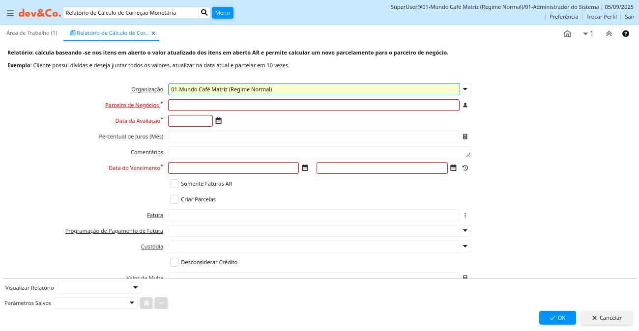 Descrição: Relatório: calcula baseando -se nos itens em aberto o valor atualizado dos itens em aberto AR e permite calcular um novo parcelamento para o parceiro de negócio.