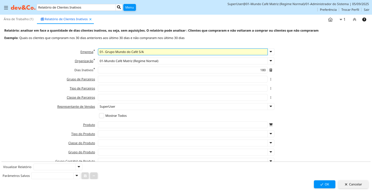 Descrição: Relatório: analisar em face a quantidade de dias clientes inativos, ou seja, sem aquisições. O relatório pode analisar : Clientes que compraram e não voltaram a comprar ou clientes que não compraram