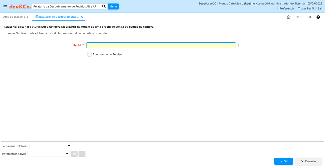 Descrição: Relatório: Listar as Faturas (AR e AP) geradas a partir da ordem de uma ordem de venda ou pedido de compra.
