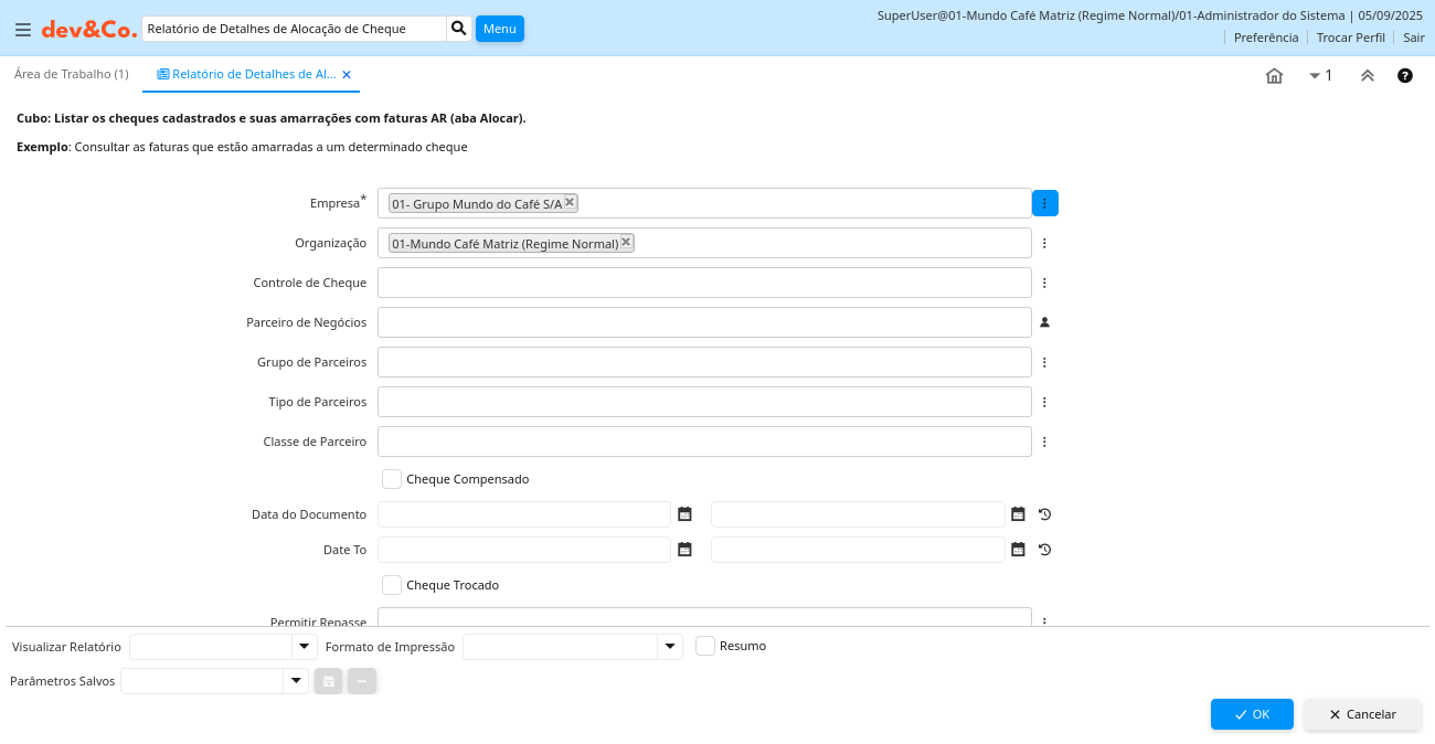 Descrição: Cubo: Listar os cheques cadastrados e suas amarrações com faturas AR (aba Alocar).