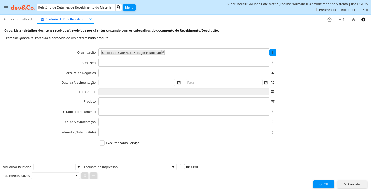 Descrição: Cubo: Listar detalhes dos itens recebidos/devolvidos por clientes cruzando com os cabeçalhos do documento de Recebimento/Devolução.