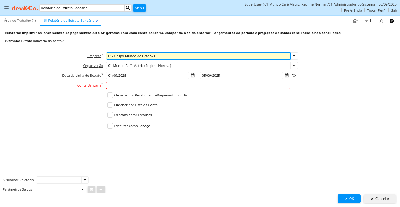 Descrição: Relatório: imprimir os lançamentos de pagamentos AR e AP gerados para cada conta bancária, compondo o saldo anterior , lançamentos do período e projeções de saldos conciliados e não conciliados.