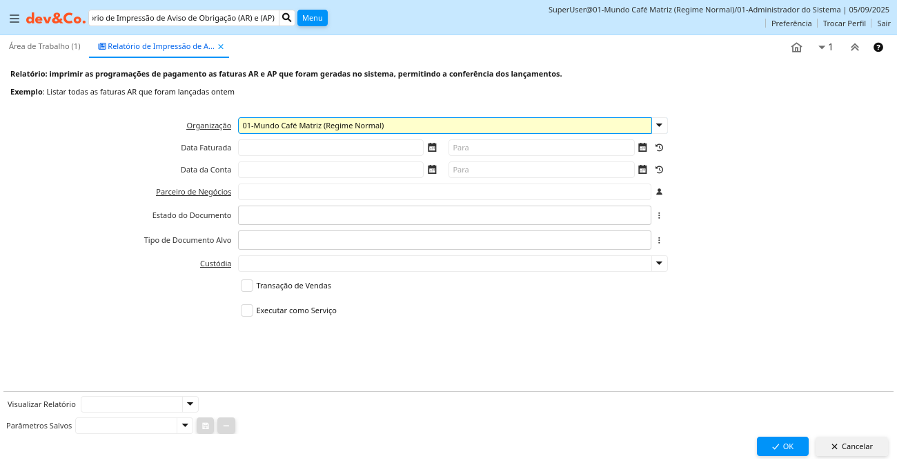 Descrição: Relatório: imprimir as programações de pagamento as faturas AR e AP que foram geradas no sistema, permitindo a conferência dos lançamentos.
