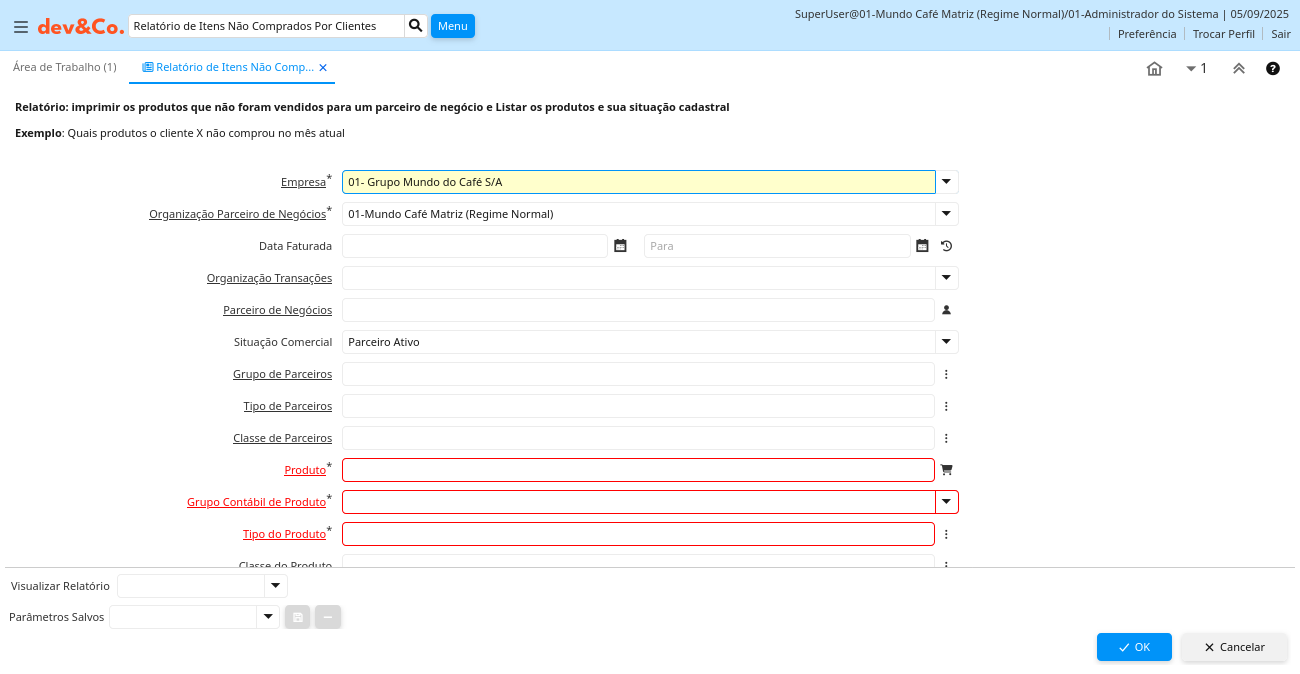 Descrição: Relatório: imprimir os produtos que não foram vendidos para um parceiro de negócio e Listar os produtos e sua situação cadastral