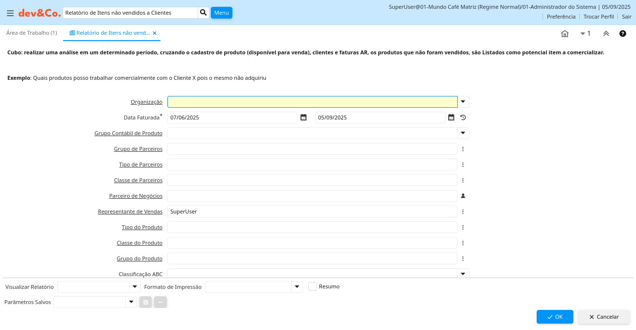 Descrição: Cubo: realizar uma análise em um determinado período, cruzando o cadastro de produto (disponível para venda), clientes e faturas AR, os produtos que não foram vendidos, são Listados como potencial item a comercializar.