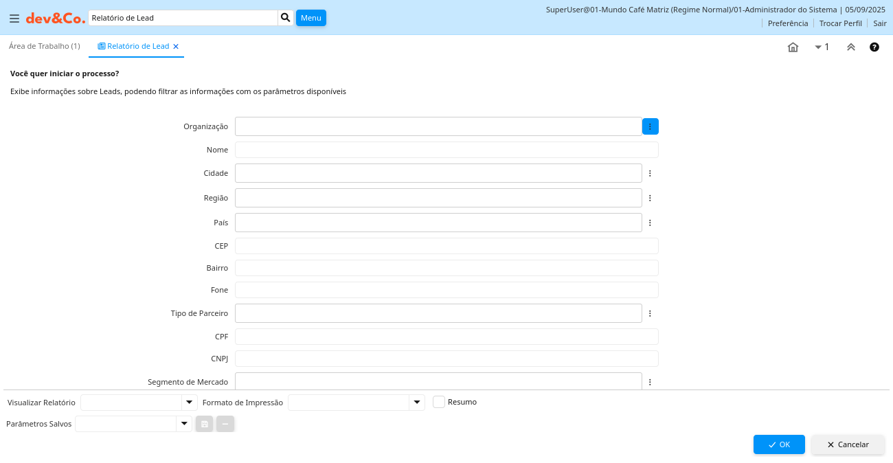 Ajuda: Exibe informações sobre Leads, podendo filtrar as informações com os parâmetros disponíveis