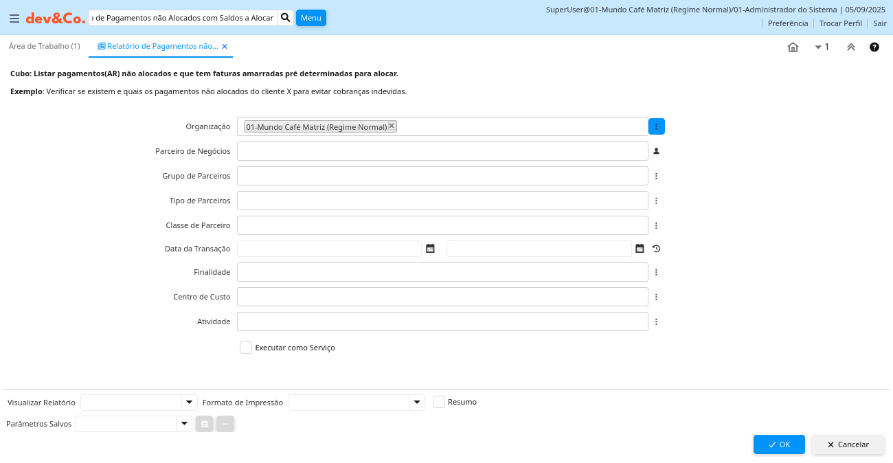 Relatório: Relatório de Pagamentos não Alocados com Saldos a Alocar