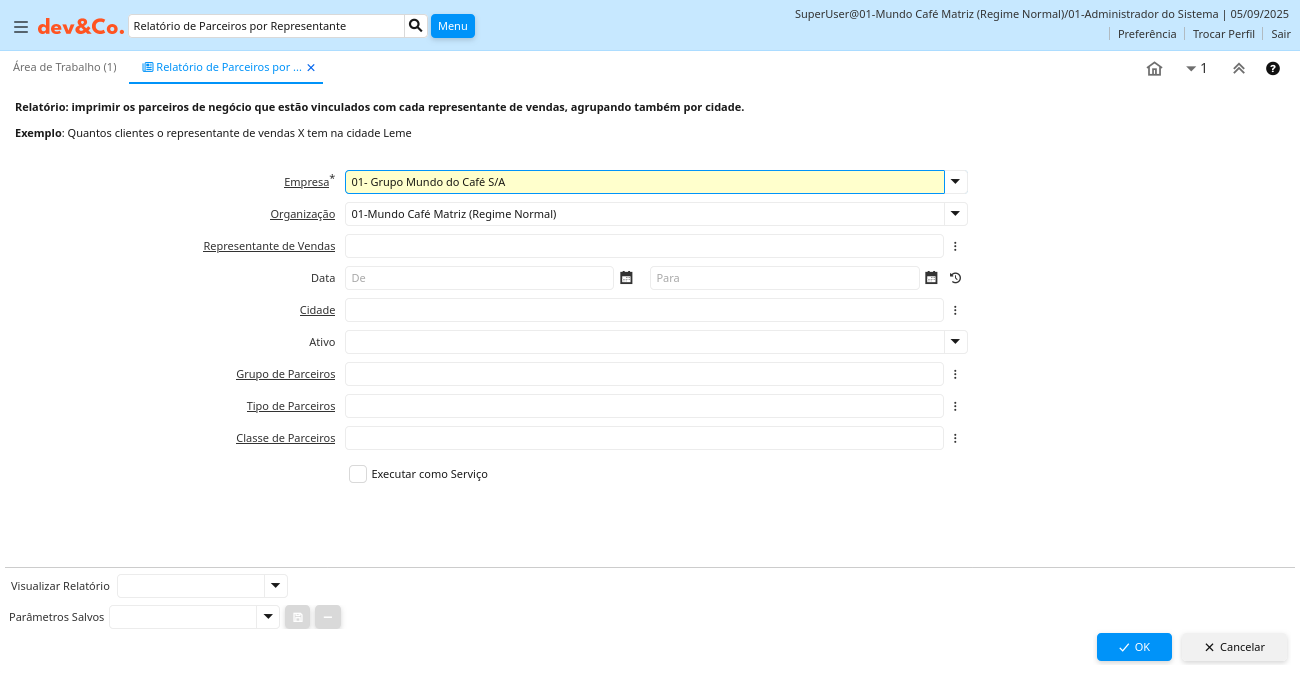 Descrição: Relatório: imprimir os parceiros de negócio que estão vinculados com cada representante de vendas, agrupando também por cidade.