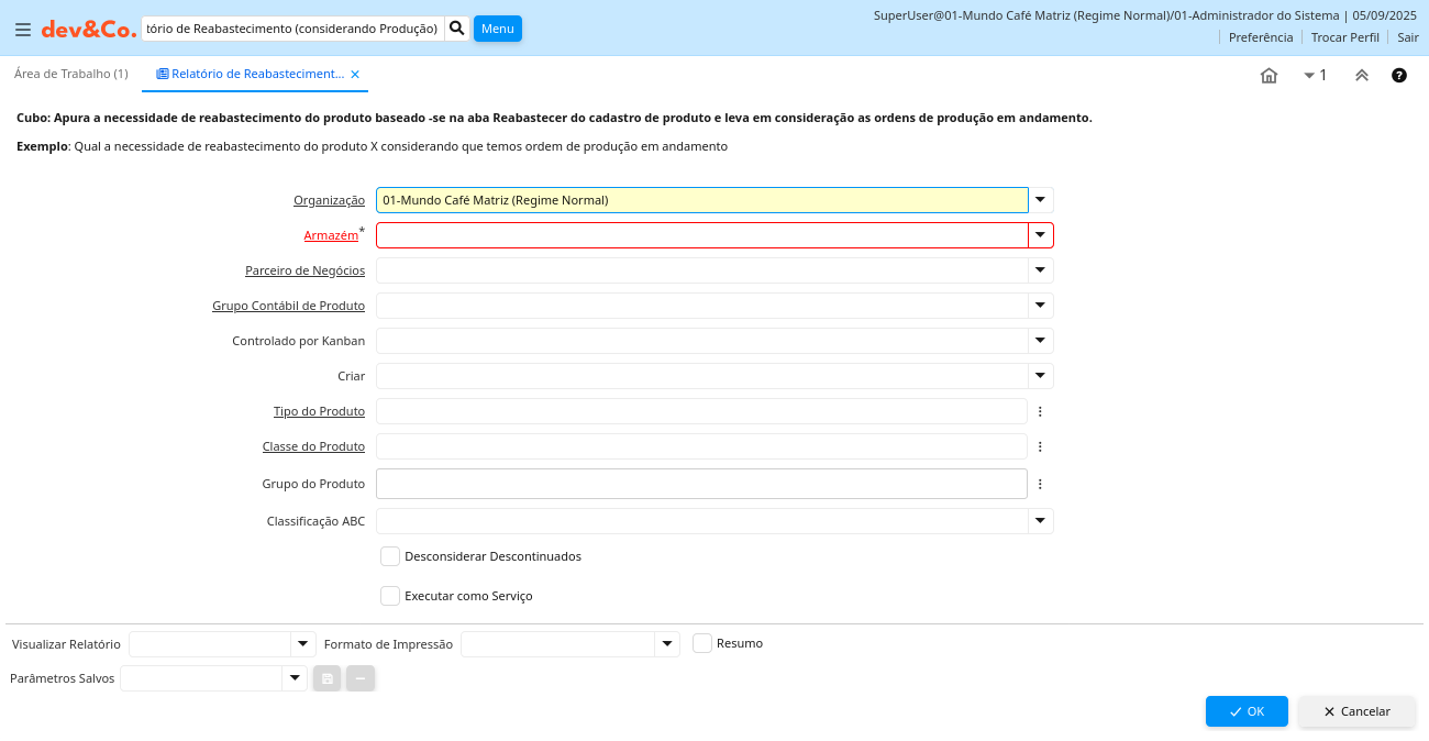 Relatório: Relatório de Reabastecimento (considerando Produção)