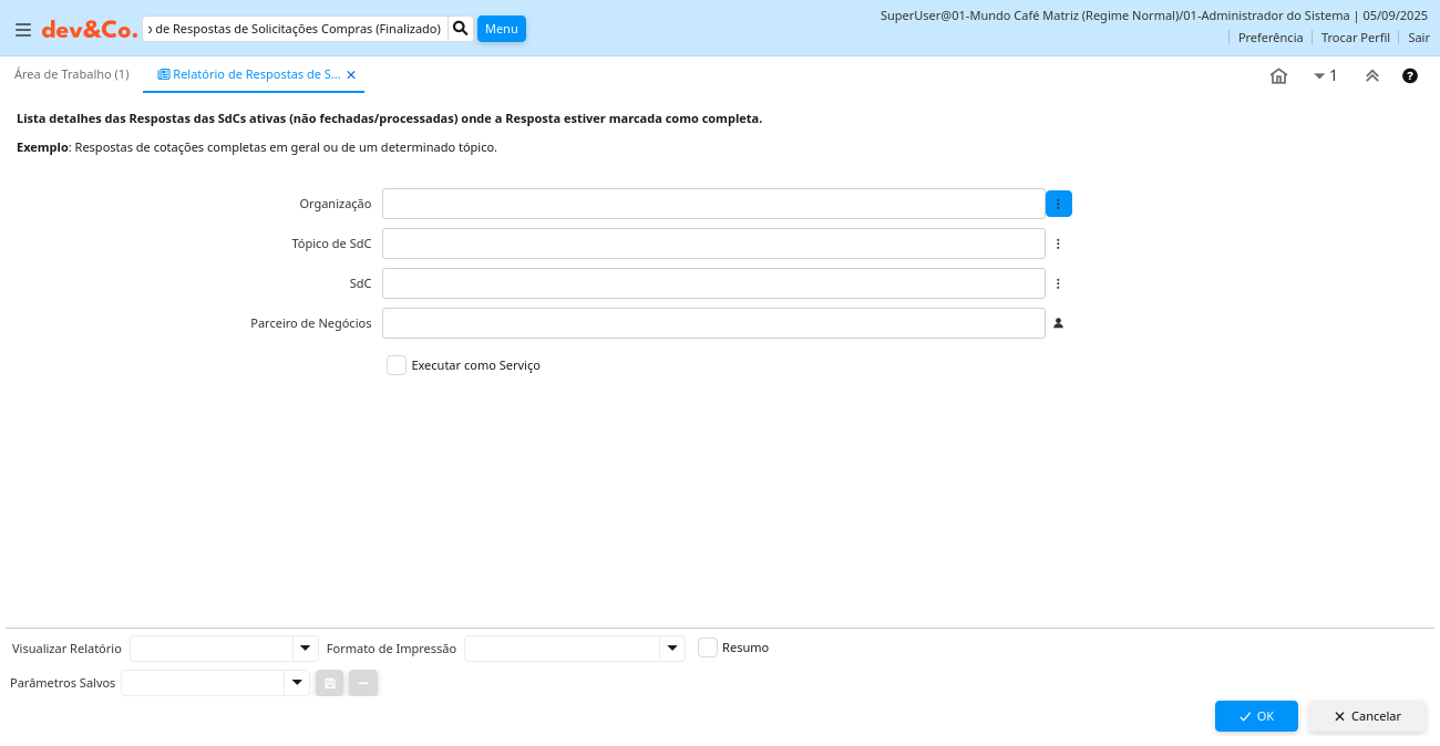 | SdC | Solicitação de Cotação | Solicitação de Cotação a ser enviada para fornecedores de um Tópico de uma SdC. Após a seleção do fornecedor, opcionalmente cria uma Ordem de Venda ou Cotação para Cliente assim como Pedido de Compra para Fornecedor(es) | C_RfQ_ID Chosen Multiple Selection Search |