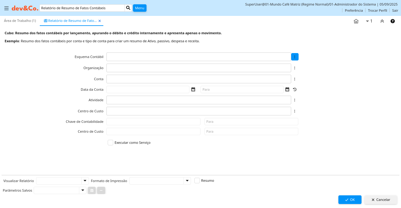 Descrição: Cubo: Resumo dos fatos contábeis por lançamento, apurando o débito e crédito internamente e apresenta apenas o movimento.