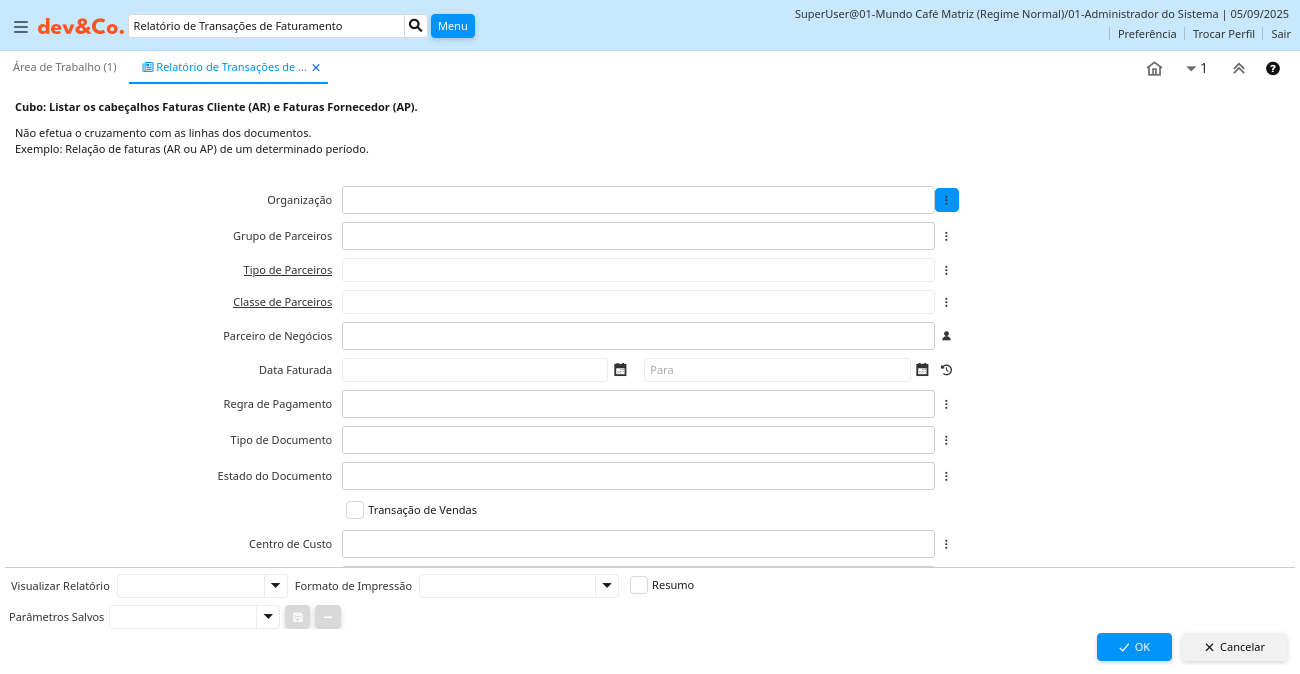 Descrição: Cubo: Listar os cabeçalhos Faturas Cliente (AR) e Faturas Fornecedor (AP).