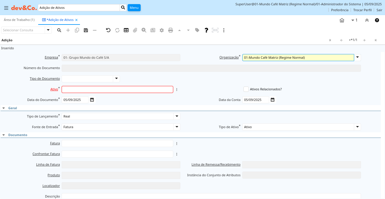 | Data do Documento | Data do Documento | A "Data do Documento" indica a data em que o documento foi gerado. Ela pode ser ou não a mesma da data contábil. | a_asset_addition.DateDoc timestamp without time zone Date |