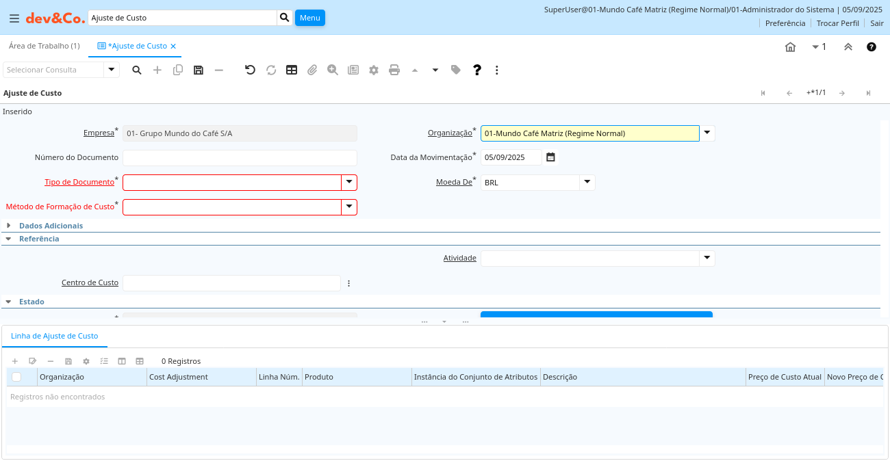 Descrição: Inserir ajustes de custo de inventário
