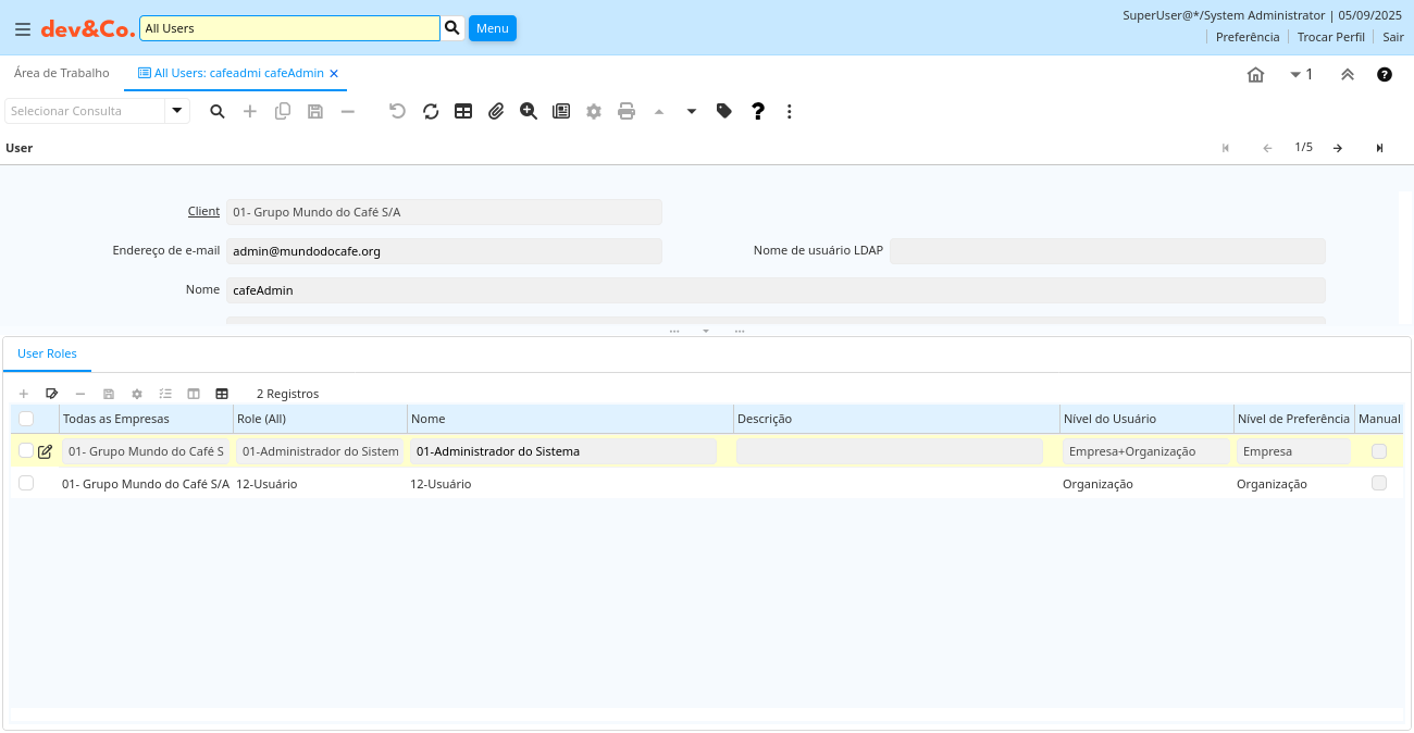 | Nível do Usuário | Sistema Empresa Organização | O campo "Nível do Usuário" determina se os usuários deste Papel (Função) terão acesso a dados do nível do Sistema, dados do nível da Organização, dados do nível da Empresa ou dados do nível da Empresa e da Organização. | ad_alluserroles_v.UserLevel character(3) List |