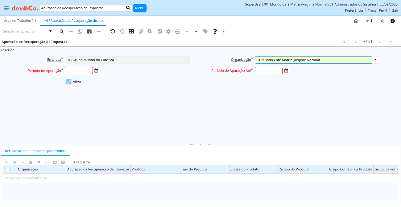 Descrição: No cabeçalho desta janela, deve-se informar os parâmetros que irão limitar o período e Organização a qual a apuração de recuperação de impostos deve ser feita.