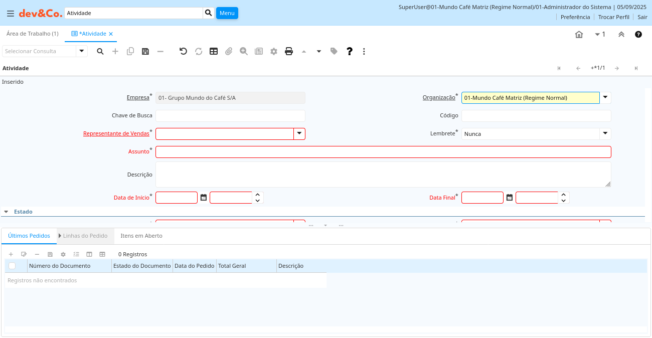 | Representante de Vendas | Representante de Vendas ou Promotor de Vendas da Companhia | O campo "Representante de Vendas" indica o representante de vendas para esta região. Qualquer Representante de Vendas tem que ser um usuário interno válido. | cof_activity.SalesRep_ID numeric(10) Table |