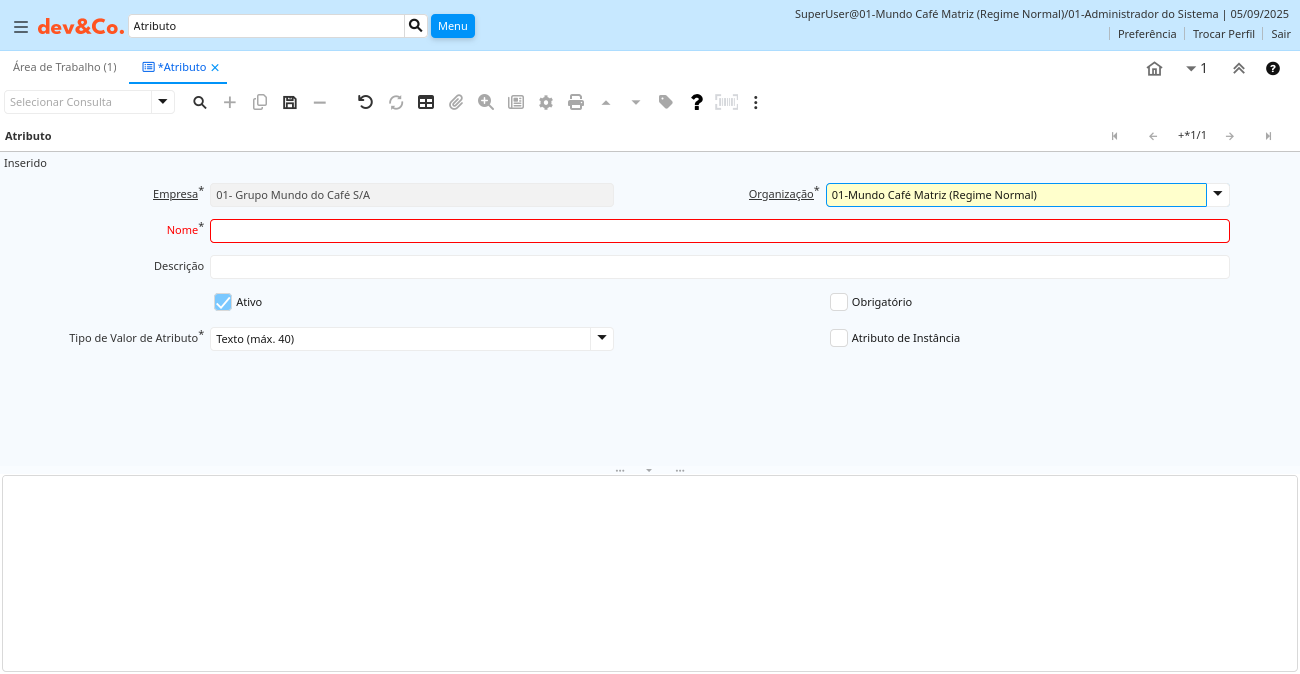 | Chave de Busca | Chave de pesquisa para o registro no formato necessário - tem que ser único e exclusivo | Uma "Chave de Busca" fornece a você um método rápido de encontrar um registro em particular. Se você deixar a chave de busca vazia, o sistema automaticamente cria um valor numérico. A seqüência de documento usada por este número de recuperação é definida na janela "Gerenciamento de Seqüência" com o nome "DocumentNo_", onde TableName é o nome real da tabela (ex: C_Order). | m_attributevalue.Value character varying(40) String |