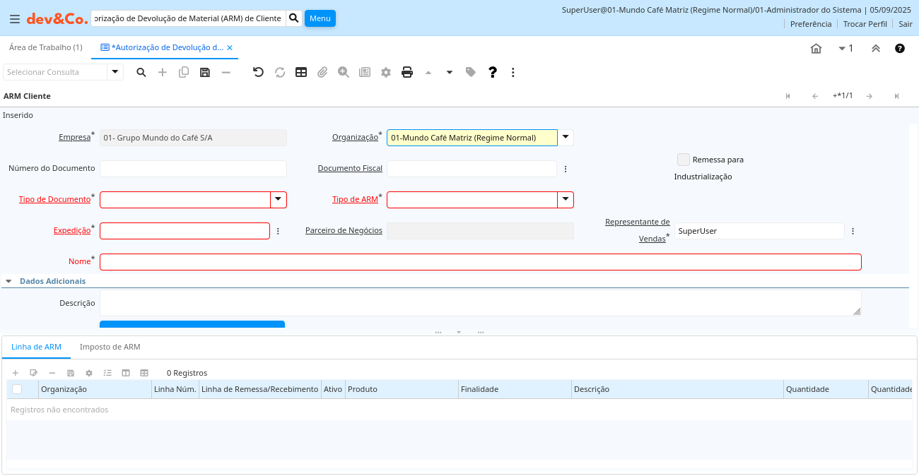 Janela: Autorização de Devolução de Material (ARM) de Cliente